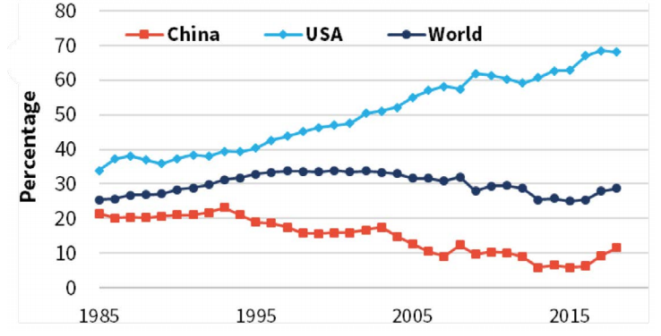 現(xiàn)代高爐和轉(zhuǎn)爐煉鋼技術(shù)已經(jīng)存在一百多年,然而,電爐煉鋼始于20世紀(jì)初,直到20世紀(jì)60年代大量廢鋼出現(xiàn)后才開始普及。早期電爐鋼生產(chǎn)受到缺乏電力供應(yīng)的限制——特別是廉價(jià)的電力,缺乏足夠的廢鋼供應(yīng),而且只能生產(chǎn)低等級的鋼鐵產(chǎn)品。在過去的50年里,對電弧爐的改進(jìn)已經(jīng)使將近80%的鋼鐵產(chǎn)品可由電弧爐生產(chǎn)。[7]擁有廉價(jià)電力和擁有足夠廢鋼或者有豐富用于DRI生產(chǎn)的天然氣的國家通常電弧爐生產(chǎn)鋼鐵產(chǎn)品比例高。2018年,美國68%的鋼鐵都是通過這種方式生產(chǎn)的,相比之下,中國的這一比例僅為12%,廢鋼不足和電價(jià)過高仍是中國電爐生產(chǎn)的限制因素。[2]圖6顯示了自1985年以來電爐占粗鋼產(chǎn)量百分比,突出看出美國和中國鋼鐵生產(chǎn)工藝路線上的差異。