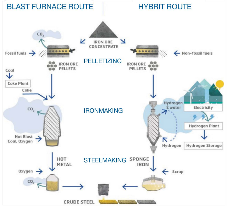左側(cè)3排:上綠圓:使用綠色電能的電爐,原料是氫還原的DRI;中綠圓:高爐中使用氫;下綠圓:循環(huán)經(jīng)濟(jì)(鋼渣和廢氣生產(chǎn)副產(chǎn)品產(chǎn)品和化工產(chǎn)品。)