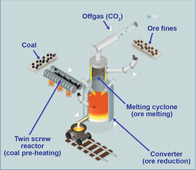 熔融還原是一種依賴于煤在鐵水中氣化的替代煤基煉鐵工藝。熔融還原過程包括兩個(gè)區(qū)域:預(yù)還原區(qū)和熔融還原區(qū)。煤進(jìn)入熔融還原區(qū)氣化,產(chǎn)生熱量和豐富的CO熱氣體,熱能在熔融還原區(qū)熔化鐵礦石,而熱氣體被輸送到預(yù)還原區(qū)。熱氣體在鐵的氧化物進(jìn)入熔煉還原區(qū)之前對其進(jìn)行預(yù)還原,最終發(fā)生還原反應(yīng)。熔融還原技術(shù)避免使用焦化工藝,往往避免了鐵礦石的團(tuán)聚過程,顯著減少了二氧化碳排放。大多數(shù)熔融還原工藝的缺點(diǎn)是需要大量的氧氣,價(jià)格昂貴,目前只有不到1%的鋼是通過熔融還原生產(chǎn)的。