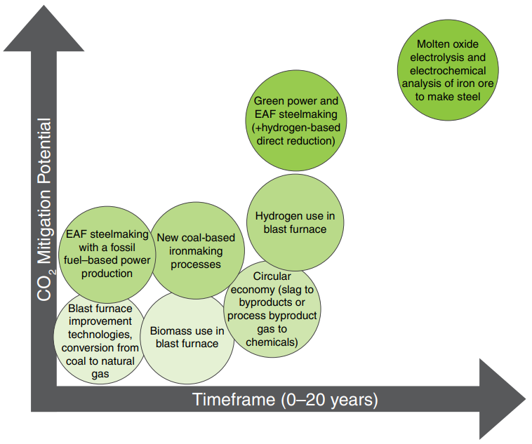 (左側(cè)1排:深綠圓圈:電爐冶煉使用化石電力能源熔化廢鋼;下面淺綠:高爐改進(jìn)技術(shù),噴煤改為噴射天然氣。