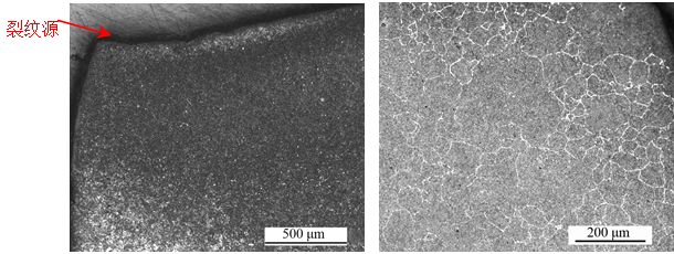 (a)裂紋源附近(25×) (b)裂紋源附近(100×)