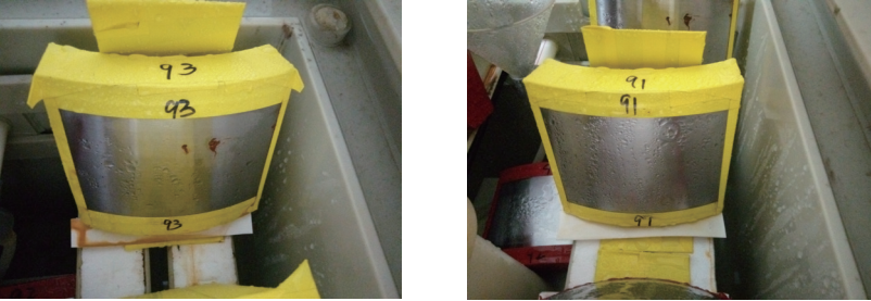 由圖3可知,Fe基熔覆層顯微組織主要包括平面晶、樹枝晶。在熔覆層底部與界面結合處,溫度梯度(G)與凝固速度(R)的比值G/R最大,組織以平面晶方式外延生長,而在熔覆層內部,主要為樹枝晶。激光熔覆工藝匹配是否合理,對Fe基熔覆層的顯微組織有著顯著的影響。當激光熔覆工藝匹配合理時,Fe基熔覆層顯微組織主要由平面晶與枝晶尺寸較小、分布相對均勻的樹枝晶組成;當激光熔覆工藝匹配不合理時,Fe基熔覆層顯微組織主要由平面晶與大小不一的樹枝晶組成,由于晶界處易產生偏析,并且晶界處的電位一般低于晶粒內部,發生微電池反應,加速腐蝕的發生,因此會直接影響Fe基熔覆層的組織形貌,降低熔覆層的耐蝕性,在使用過程中更易失效。Fe基熔覆層的失效分析可以采用鹽霧腐蝕試驗來判斷。制備Fe基熔覆層鹽霧腐蝕試驗樣塊,按照《人造氣氛腐蝕試驗鹽霧試驗GB/T10125—2012》規定進行鹽霧試驗。不同Fe基熔覆層48h鹽霧腐蝕試驗結果對比如圖4所示。