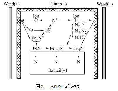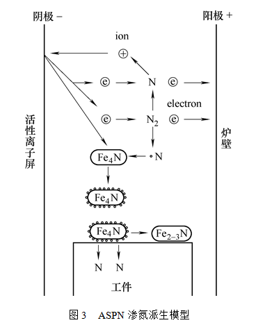 雖然Georges發(fā)明了ASPN技術(shù),但早期的ASPN技術(shù)的基礎(chǔ)研究都是在英國伯明翰大學(xué)表面工程研究室進(jìn)行的。Li C. X.等人通過試驗(yàn)發(fā)現(xiàn),ASPN可以獲得和DCPN一樣好的滲氮效果,并較好地解決了DCPN技術(shù)難題,是一項(xiàng)值得推廣的新技術(shù)。他們還在試驗(yàn)的基礎(chǔ)上,參照經(jīng)典的K?lbel離子滲氮模型上,最先提出了一個ASPN 的滲氮模型(見圖2),認(rèn)為從籠子表面濺射下來的Fe粒子與空間的N原子結(jié)合形成FeN粒子,這些粒子沉積在滲氮試樣的表面發(fā)生分解,釋放出來的活性氮原子滲入工件表面實(shí)現(xiàn)滲氮;在模型的右端,從籠子上濺射下來Fe4N粒子沉積在工件表面也能起到滲氮的作用,但其未解釋這部分的滲氮機(jī)制。