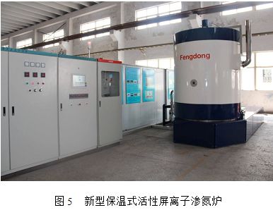2012年江蘇豐東熱技術(shù)有限公司、青島科技大學(xué)以及江蘇省熱處理及表面改性工程技術(shù)研究中心三方合作,研制成功了具有特色和自主知識產(chǎn)權(quán)的新型活性屏離子滲氮設(shè)備(見圖5),并通過了中國熱處理行業(yè)協(xié)會組織的技術(shù)鑒定。該設(shè)備的籠子尺寸為φ1300×1500mm,工作臺直徑為1200mm。這套裝置采用了保溫式的爐體、雙測溫控溫系統(tǒng)、爐內(nèi)壓力雙閉環(huán)自動控制系統(tǒng)、框式爐體升降移動系統(tǒng)、快速充氮冷卻系統(tǒng)等多項(xiàng)專利技術(shù),特別是保溫式爐體,具有結(jié)構(gòu)簡單合理、升溫速度快、節(jié)能效果顯著等優(yōu)點(diǎn),可進(jìn)一步提高爐內(nèi)空間溫度均勻性。