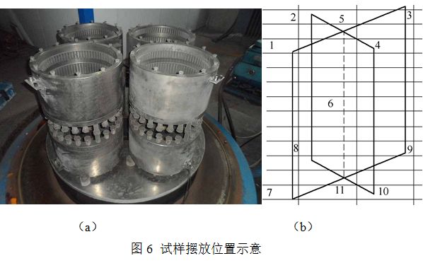 為了比較新研制的活性屏離子滲氮設(shè)備與普通的離子滲氮爐滲氮效果,分別在保溫式活性屏離子滲氮爐和LDMC-100F普通水冷壁式離子滲氮爐內(nèi)擺放了8個42CrMo內(nèi)齒圈,齒圈外形尺寸為φ500×500mm,每個齒圈重約70kg。在8個大齒圈的不同部位擺放了11個42CrMo試樣,擺放的位置見圖6。