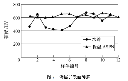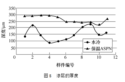 圖7和圖8分別是這兩種爐子滲氮處理后不同位置的試樣的表面硬度和滲氮層的厚度的分布。結(jié)果表明,用保溫式ASPN設(shè)備處理的試樣表面硬度和滲層厚度的均勻性均好于水冷式離子滲氮爐,這說明保溫式ASPN爐內(nèi)工件的溫度均勻性優(yōu)于水冷式離子滲氮爐。另外,保溫式ASPN設(shè)備可比水冷式離子滲氮爐節(jié)電25%以上。