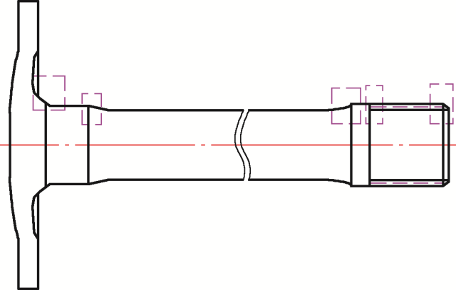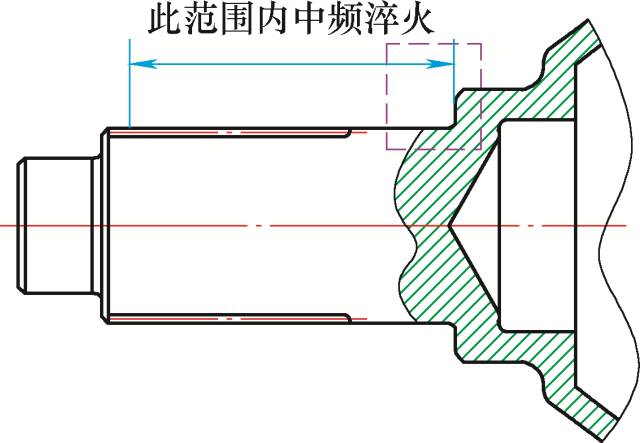 廠家為避免此種情況,將淬火區域調整到如圖2所示,淬硬層中斷,大大降低了前殼的扭轉強度,發生早期斷裂。對于前殼承受扭矩的零件,淬硬區必須過大直徑倒角,因此對于類似階梯軸產品,要檢驗是否得到連續、不中斷的淬硬區域,就要考慮在臺階部位進行取樣檢測(圖1 虛線框處)。