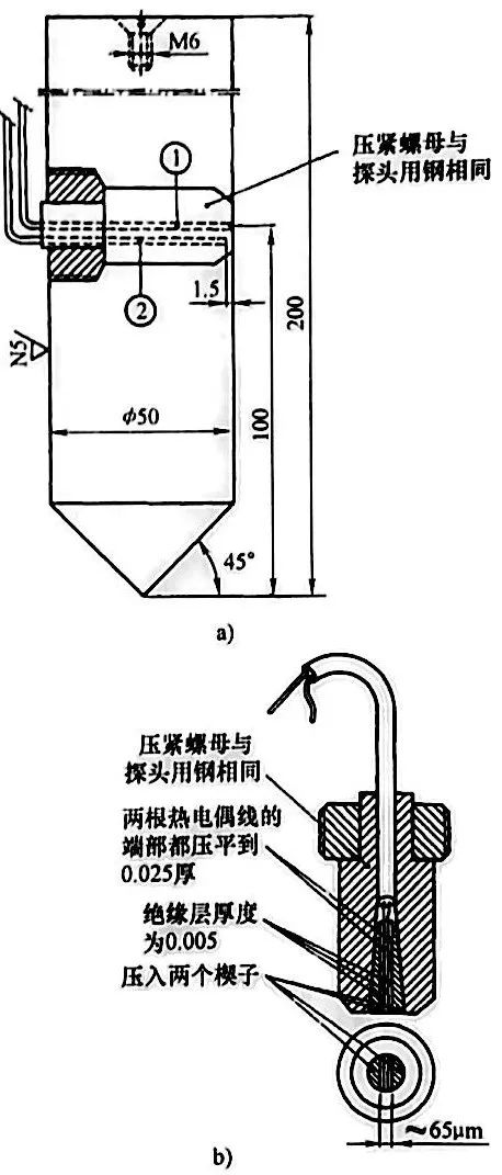 溫度高于絕對 “0” 度的所有物體都包含一定量的熱能(內能和動能之和), 大小與其溫度直接相關,由于溫度更容易測量,所以系統的熱能狀態通常用溫度來表征。熱電偶是記錄材料加工過程中溫度變化最常用的工具。熱電偶要么放置在零件內部(鉆孔插入), 要么直接與零件表面接觸。第一種情況下,用各種高溫粘結劑將熱電偶固定到零件上。在有些研究中,會采取措施來防護熱電偶護套和零件之間的熱觸點。保持熱電偶與零件表面接觸的方法有兩種:內在的和外在的。內在的是材料組成了熱電偶環路的一部分,外在的是先將兩個熱電偶導線焊接起來,然后將連接點 點焊到零件表面。茨曾(Tszeng) 和薩拉夫(Saraf) 闡明,在表面安裝熱電偶帶來的鰭效應會影響測量的溫度,因此,他們建立了數學模型來校正它。這個模型能被嵌入一個更一般的零件熱有限元模型中。南馬可探頭(圖2 ) 是在探頭表面鉆垂直于表面的孔來放置熱電偶的尖端的。