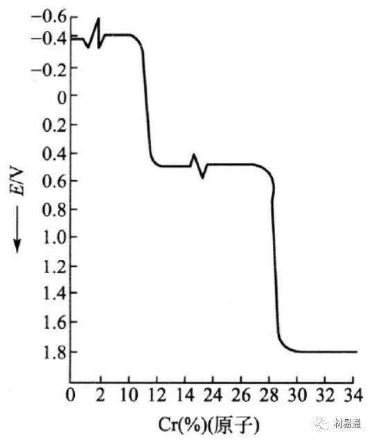 研究表明,當Cr加入鐵中形成固溶體時,鐵固溶體的電極電位能顯著提高,如下圖所示。材料電極電位的提高,可使材料的耐蝕性得到明顯改善。