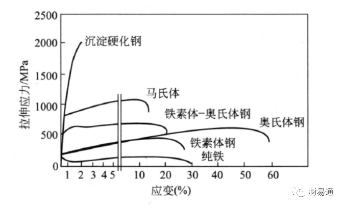 鐵素體+奧氏體雙相不銹鋼的強度較高、延展性也較好;鐵素體不銹鋼、奧氏體不銹鋼的強度性能相近,但后者的延展性遠較其他各類不銹鋼為高。(圖中為了比較還列有純鐵的曲線)