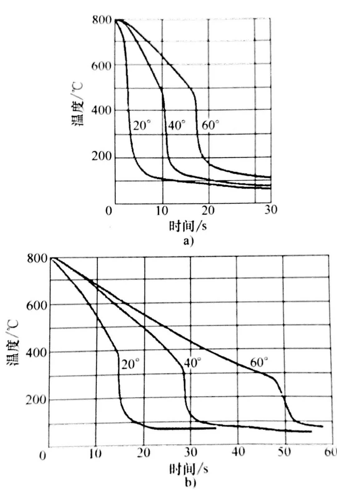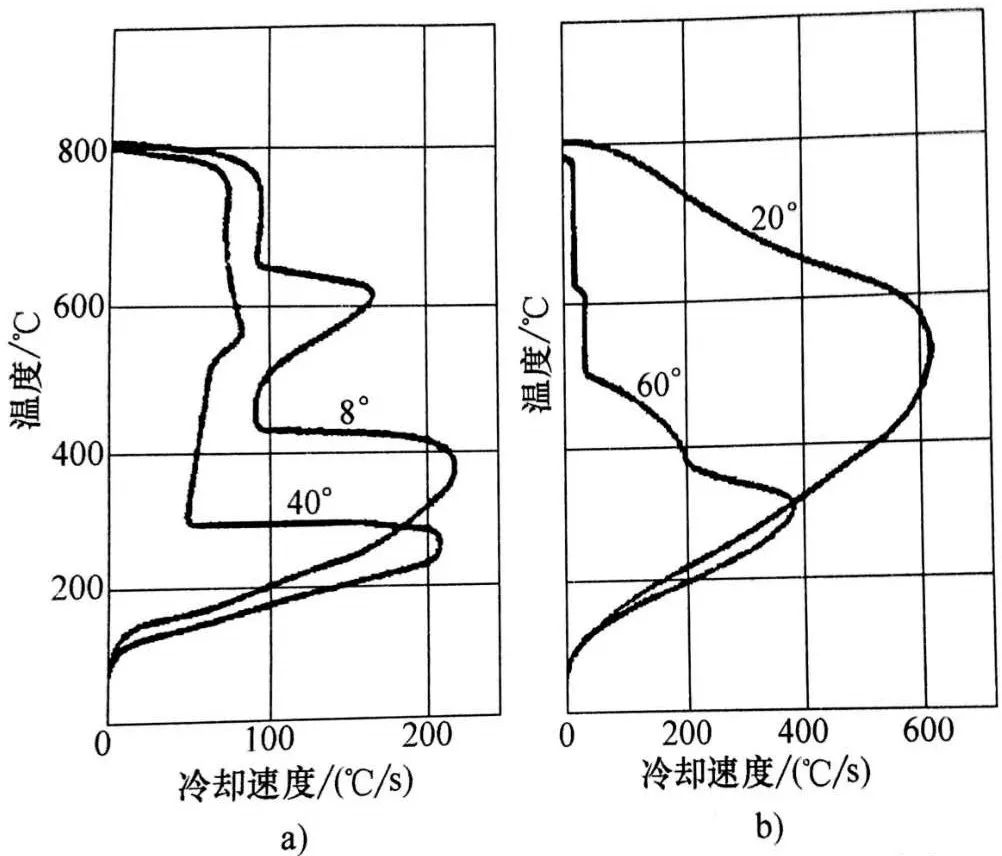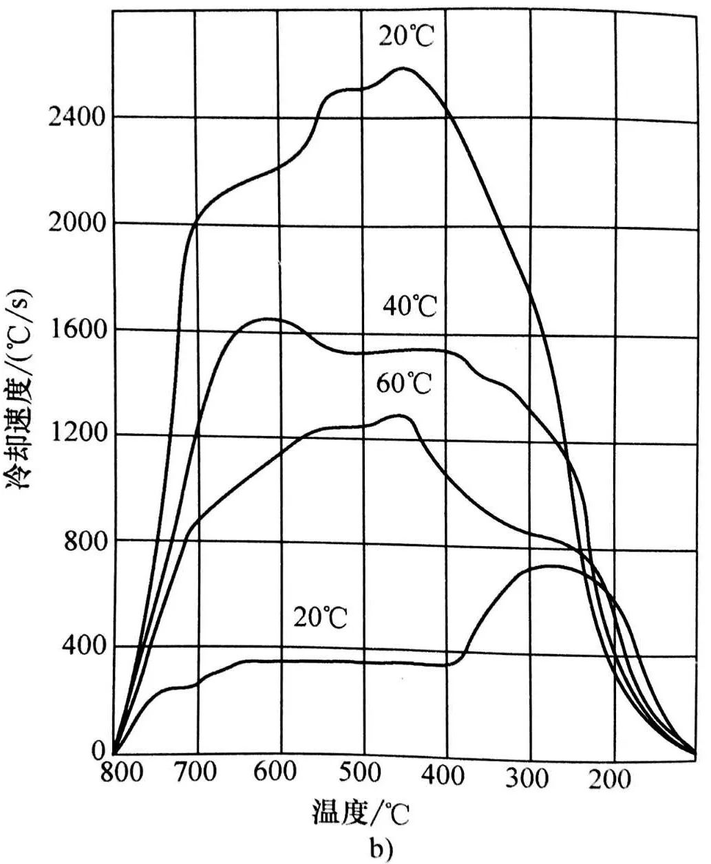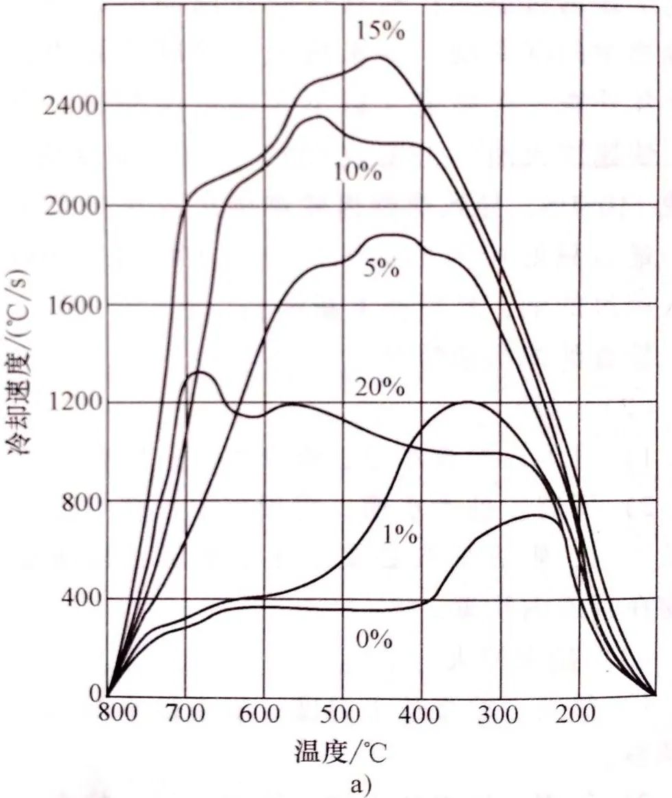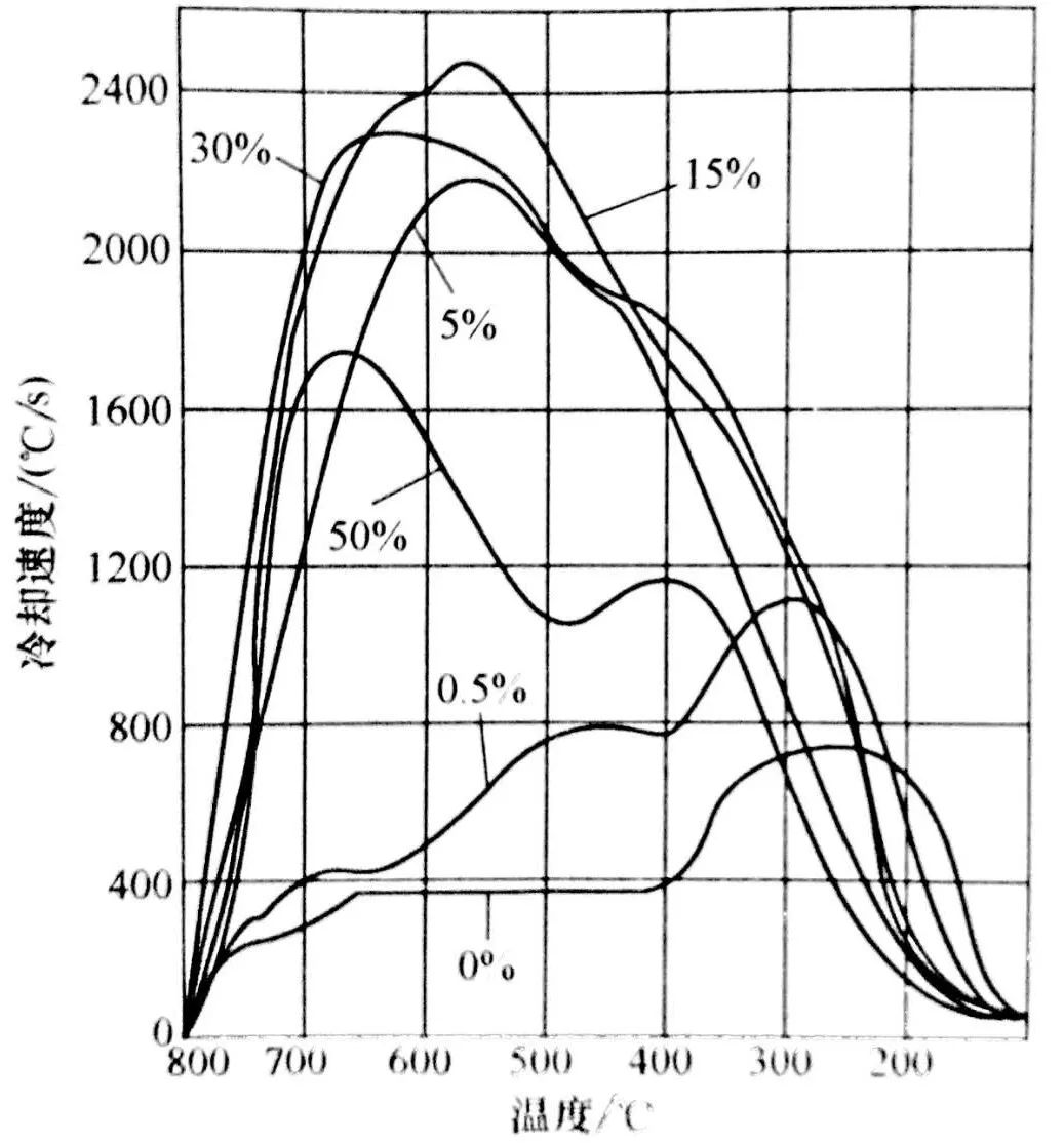 在水中加入15%的 NaCl 可以得到最理想的冷卻速度。雖然提高鹽水溫度會使淬冷烈度產生期望的降低,如圖4 b)所示,但是水的蒸汽膜冷卻階段并不伴隨著這種降低而延長。NaCl 水溶液最常見的替代物是NaOH 水溶液。加入NaOH 對冷卻速度增加的影響類似于 NaCl 在更高溫度下的效果。但是,在大多數鋼的馬氏體轉變溫度區域[低于350℃ (660℉) ]的冷卻速度比 NaCl 慢,這有望降低開裂敏感性。圖5所示,為 NaOH 濃度對冷卻速度的影響。