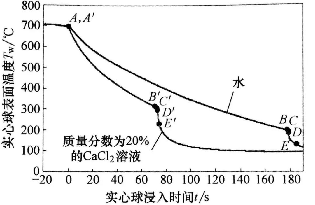 ▲圖7 濃度為20%的 CaCl, 對蒸汽膜破潰的影響圖6 中在純水冷卻曲線上標記為A、B、C、D和E的點表示: