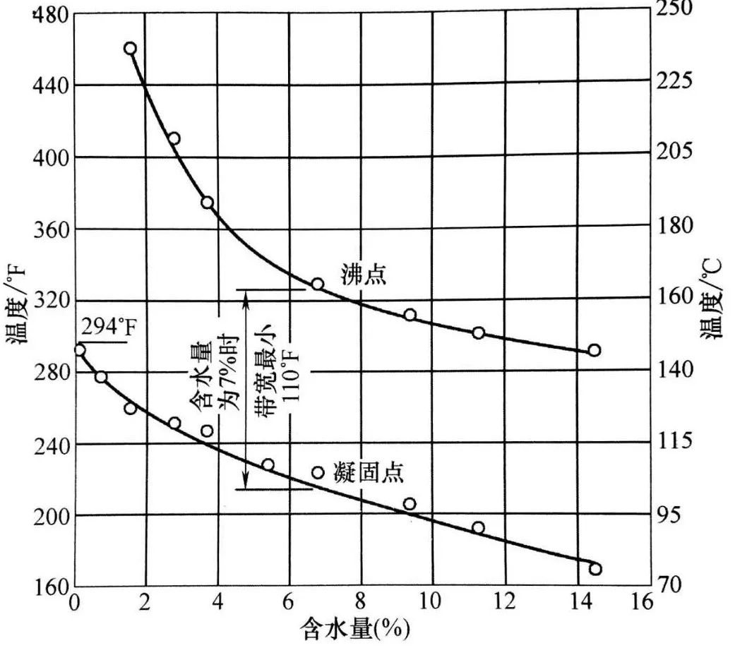 含水量對 KNO3+NaNO2+NaNO3 三元混合鹽沸點和凝固點的影響如圖11 所示。