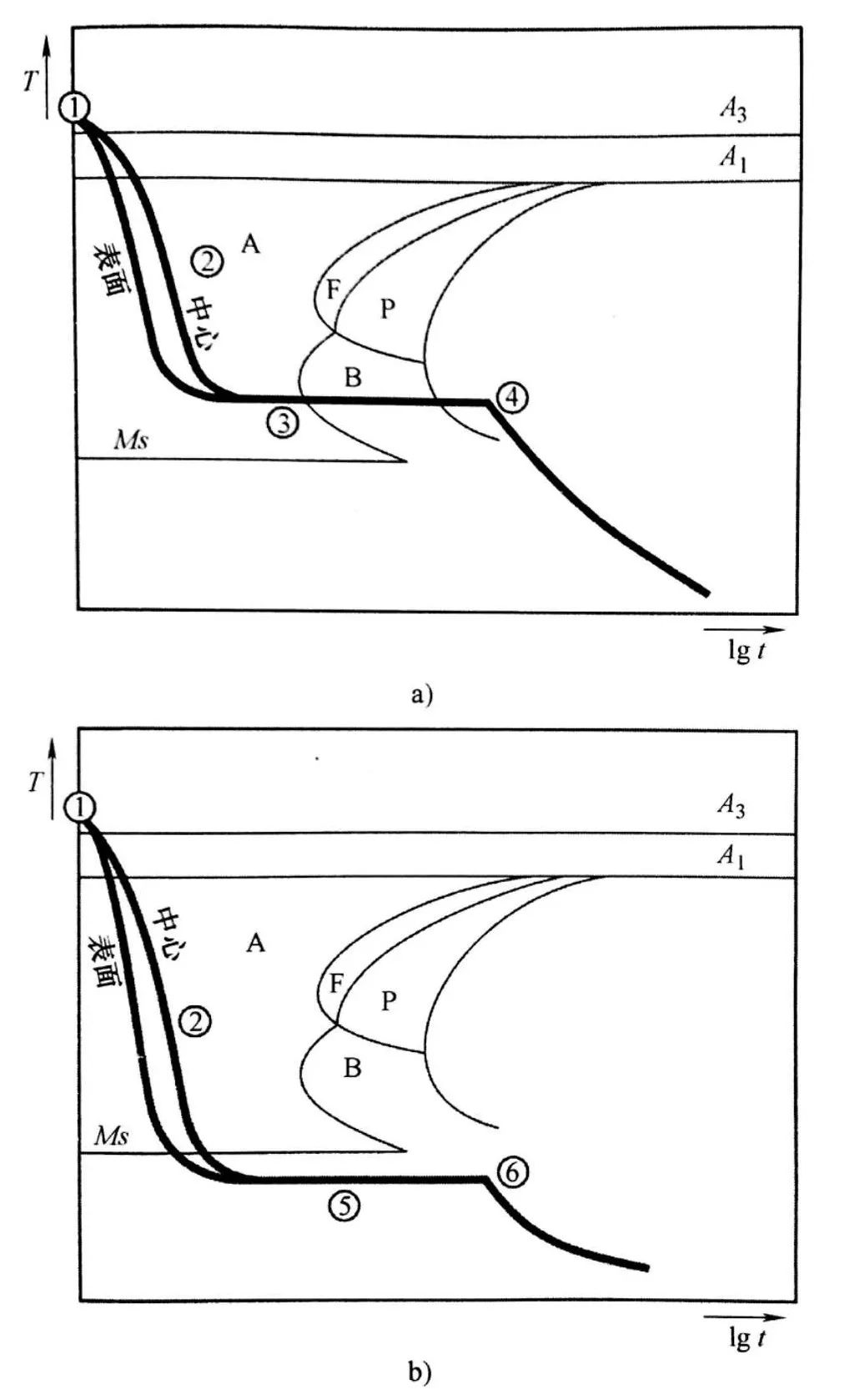 2) 冷過轉變曲線珠光體“鼻尖”之后到馬氏體轉變之前的一個合適溫度下等溫(均溫), 將降低不希望出現的變形和開裂風險(分級淬火)。