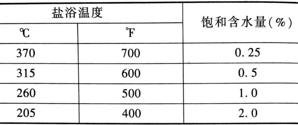 圖11 也表明,隨著水的加入,沸點降低得更迅速。據報道,只要鹽浴溫度保持在含水混合物(即鹽浴)最終的沸點以下含水量可以長時間保持。但是,當熾熱鋼件浸入含水混合物中后,溫度可能暫時超過沸點,一部分水將被汽化,要維持這個組分則要添加新水。因此,為減少淬火過程中水分的流失,較好的辦法是使淬入的鹽混合物溫度更靠近凝固點而不是沸點。迪拜鋁業(Dubal ) 報道稱,加入1%的水將使干鹽(無水的鹽)的熔點降低11℃ (20°F) , 而加入2% 的水則降低19℃ (35°F) 。雖然三元混合鹽淬火的溫度范圍為150~600℃ (300~1110°F), 但是加入10% 的水便可以在80℃ (175°F)的低溫下進行鹽浴淬火。更具代表性的含水量是0.5%~2%, 以滿足更常規的操作溫度范圍150~290℃ (300~550°F) 。添加的水不是淡水,而是清洗槽里的鹽溶液。也有人用低壓蒸汽代替水的。水在鹽浴中的飽和含水量與鹽浴溫度的函數關系見表10 。出于安全考慮,要求將水加入良好攪拌的鹽浴中而不能加入無攪拌的鹽浴中。熔融鹽的淬冷烈度與礦物油大致相同,兩者的格羅斯曼 H 值對比見表11 。兩者的冷卻速度都慢于水、鹽水溶液以及聚合物水溶液。隨著聚合物水溶液組成、濃度及攪拌方式的改變,淬冷烈度的變化范圍可以涵蓋從熔融鹽和礦物油到鹽水溶液的淬冷烈度。