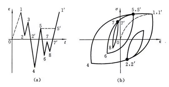 如構(gòu)件承受的變應(yīng)變循環(huán)如下圖,則在穩(wěn)態(tài)下構(gòu)件的應(yīng)力應(yīng)變響應(yīng)如圖示。