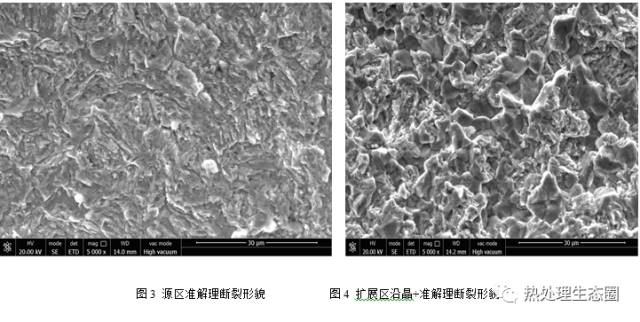 產(chǎn)品在車加工后發(fā)現(xiàn)大端端面存在幾條斷續(xù)周向裂紋,裂紋位置及形態(tài)相似,均位于距端面外壁約2mm,并斜向外擴(kuò)展。裂紋斷面觀察結(jié)果表明斷面較平坦、有金屬光澤,裂紋起源于大端面次表面,呈準(zhǔn)解理形貌,未見明顯材料缺陷,擴(kuò)展區(qū)呈沿晶+準(zhǔn)解理形貌,斷口形貌特征表明陽球的開裂模式為脆性開裂,且是在熱處理之后所形成。