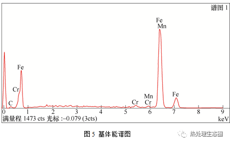 對(duì)基體進(jìn)行能譜分析主要含有Fe、Cr(1.2%)、Mn(1.3%)元素,主合金元素及含量符合20CrMnTi的要求,見圖5。