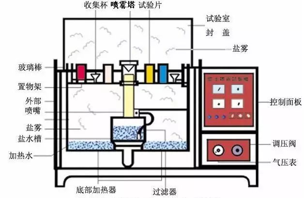 人工模擬鹽霧環境試驗是利用一種具有一定容積空間的試驗設備——鹽霧試驗箱(如圖),在其容積空間內用人工的方法,造成鹽霧環境來對產品的耐鹽霧腐蝕性能質量進行考核。