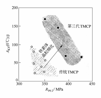 第三代TMCP工藝是針對占鋼產(chǎn)量50%以上的長形鋼材,特別是針對大截面H型鋼的生產(chǎn)工藝特點而開發(fā)的一項工藝冶金技術(shù)。 以翼緣厚度超過80mm的大截面H型鋼為例,介紹一下第三代TMCP工藝特點。以前,建筑用大厚度箱式柱都是采用厚鋼板通過焊接方法組裝而成的,如果能用軋制方法,直接生產(chǎn)出大截面(翼緣厚度大于80mm)H型鋼,用H型鋼直接作為建筑結(jié)構(gòu)的箱式柱,不但減少焊接,而且可靠性提高,施工效率提高,因此近年來在高層建筑的立柱中應(yīng)用不斷增加。 在制造大截面特厚H型鋼時,由于萬能軋機的軋制力相對較小,每道次的形變量1%~10%也較小,因此不可能像軋制厚鋼板那樣采用大軋制力、大壓下的控制軋制技術(shù)(TMCP),導(dǎo)致大截面H型鋼的組織不能充分細化,無法達到抗震性能所要求的韌性。 為克服H型鋼制造工藝的局限性,采用了最大限度發(fā)揮夾雜物(析出物)促進鐵素體相變的功能,開發(fā)了與傳統(tǒng)TMCP不同的一種新型TMCP工藝,采用此工藝能制造出與用厚鋼板制造的箱式柱韌性相當?shù)闹锰睾?/span>H型鋼。如果把控制軋制方法稱為第一代TMCP,把控制軋制+控制冷卻方法稱為第二代TMCP,則開發(fā)的新型TMCP工藝就稱為第三代TMCP工藝。第三代TMCP工藝示于圖1。 圖1 第三代TMCP工藝示意圖 由圖1可以看出,第三代TMCP工藝適用于采用V-N微合金化的高強度低合金鋼,整個軋制過程由兩個冶金階段組成。再加熱溫度希望盡可能低,以獲得均勻細小的奧氏體晶粒。第一階段是在奧氏體再結(jié)晶區(qū)軋制,通過形變-再結(jié)晶的反復(fù)進行,獲得盡可能細的奧氏體晶粒。緊接著的第二階段軋制是在VN析出溫度區(qū)間,即VN析出的鼻子溫度區(qū)間進行,促進VN在奧氏體晶界和晶內(nèi)析出,在隨后的加速冷卻過程中在奧氏體晶界和晶內(nèi)以VN粒子為核心生成大量鐵素體,細化鋼的最終組織。 在第三代TMCP工藝中,奧氏體晶粒尺寸對最終組織的細化起很重要的作用,如圖2所示。通過再加熱溫度的控制和奧氏體的反復(fù)再結(jié)晶,使奧氏體晶粒盡可能細化。細化了的奧氏體,增加了奧氏體的晶界面積,導(dǎo)致晶界鐵素體的數(shù)量密度增加,最終細化鐵素體晶粒。 圖2 奧氏體晶粒尺寸對V-N鋼700℃等溫轉(zhuǎn)變時晶界鐵素體密度的影響 采用第三代TMCP工藝的主要優(yōu)點是提高V-N鋼的性能,如圖3所示,與普通工藝相比,采用第三代TMCP工藝細化了微觀組織,使V-N鋼的屈服強度和0℃夏比沖擊功同時顯著提高。采用第三代TMCP工藝生產(chǎn)的大截面厚壁H型鋼具有與厚鋼板同樣的優(yōu)異性能。 圖3 第三代TMCP工藝對V-N鋼性能的影響
