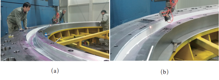 設計專用的支撐胎具,將胎具放置在工作臺上,并使得胎具承載齒圈。支撐胎具,即6m大型整體工裝,主要用于增強齒圈本身的剛性,便于裝夾和找正;找正齒圈基準在0.020mm以內,然后計算和調整機床輸入參數,以便加工時齒圈的線速度滿足激光淬火的要求,如圖2所示。