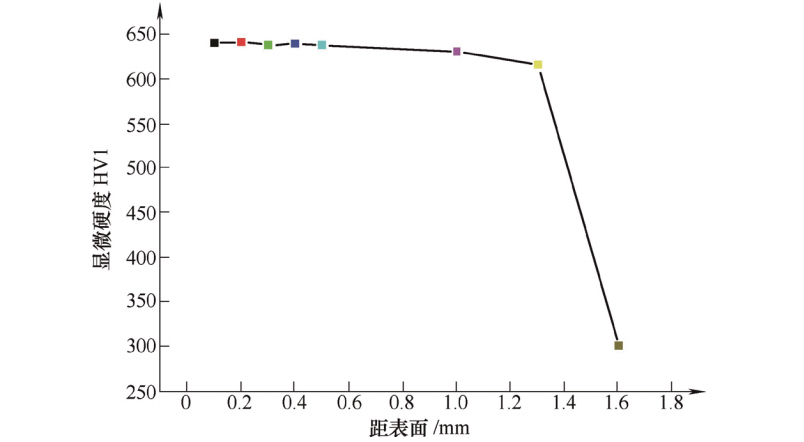 采用高功率激光束照射導軌面,以極快速度加熱導軌表面并自冷淬火,采用同熔煉號、同調質、同控制截面的熱處理試樣進行激光淬火效果驗證(圖4為淬火后的表面),沿掃描帶剖開,采用沃博特顯微維氏硬度計檢測顯微硬度,表面硬度達到57HRC,層深達到1.4mm,表面激光淬火區域的奧氏體晶粒度平均組織為30μm(對應平均晶粒度7級),如圖5、圖6所示。齒圈采用同試樣激光淬火工藝,激光淬火后齒圈導軌表面硬度達到56~57HRC,表面無氧化脫貧,無裂紋、凹坑等外觀缺陷,各項性能可以滿足要求。