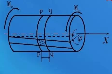 在軸表面作圓周線和縱向線,在扭轉力偶矩作用下,圓周線長度形狀不變,各圓周線間距離不變,只是繞軸線轉了一個微小角度;縱向平行線仍然保持為直線且相互平行,只是傾斜了一個微小角度。變形如圖所示。