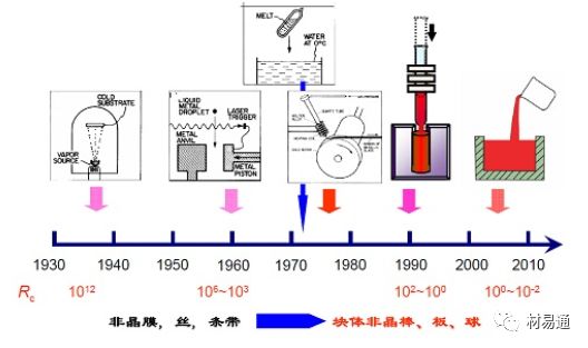 塊體非晶經(jīng)過三十多年的發(fā)展,從貴金屬的Pd基和Pt基到相對廉價的Zr基、Hf基和La基,甚至更低廉的Cu基、Ti基和Fe基。制備技術(shù)也有了新的發(fā)展。
