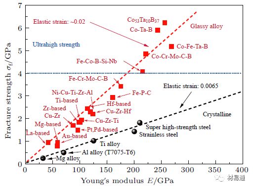多種典型塊體非晶合金和晶態(tài)合金的斷裂強度與楊氏模量的關(guān)系