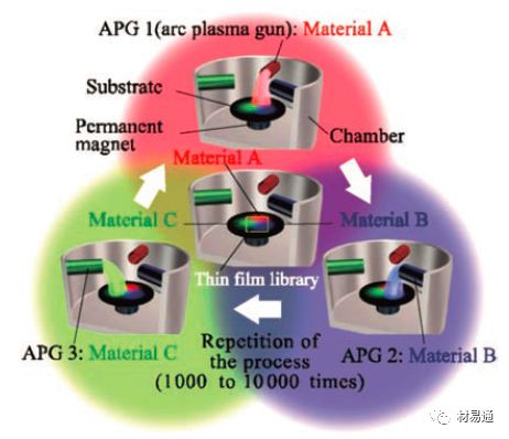多靶順序沉積法如下圖所示, 這種方法同樣是利用鍍膜技術(shù)使各材料在沉積過程中形成具有厚度梯度的多層膜, 最終獲得成分梯度。不同的是,沉積源和襯底之間不安裝掩膜, 厚度梯度的形成依靠沉積源和襯底各處之間的距離來控制. 材料A 沉積結(jié)束后將沉積源隔離或關(guān)閉, 之后用同樣的過程沉積B 和C, 經(jīng)過多次循環(huán)后形成組合材料庫. 在制備過程中, 每次沉積的薄膜的厚度只有幾個納米, 以保證成分在薄膜厚度方向上的均勻性。