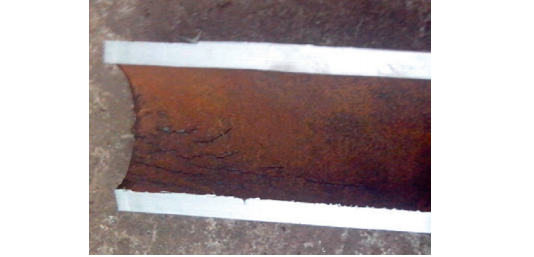 裂紋都在內表面,筆直有力,深度為2~5mm,長度為20~200mm,裂口尖銳,說明開裂時應力較大,是典型的淬火裂紋。圖2是裂紋在顯微鏡下的照片。