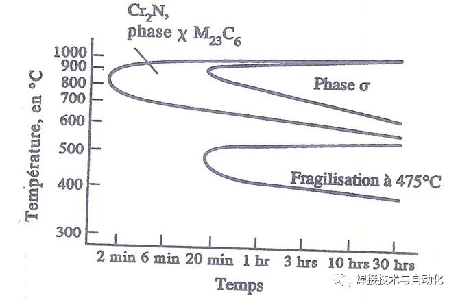 碳化物析出相中主要有M7C3和M23C6兩種類型。在碳元素含量相對較高(≥0.03%)的雙相不銹鋼中,于950~1050℃溫度范圍內熱處理時,沿鐵素體和奧氏體的兩相相界處將會析出產生M7C3型碳化物。而在低于950℃的溫度下熱處理時,沿兩相相界處則會析出產生M23C6型碳化物,并且其析出速度很快,例如2507型鋼在800℃下,其M23C6型碳化物的析出時間不到 1min,即使采取快速冷卻方法也很難避免這種碳化物的產生,其先是在鐵素體和奧氏體的兩相相界處產生,隨后在鐵素體以及奧氏體的晶界處也有析出,但在鐵素體和奧氏體內卻并未出現。M23C6晶粒在長大過程中,將會消耗其近鄰區域鐵素體含量,進而導致原來的鐵素體區轉變為二次奧氏體組織,從而形成M23C6和γ相的聚集區域。