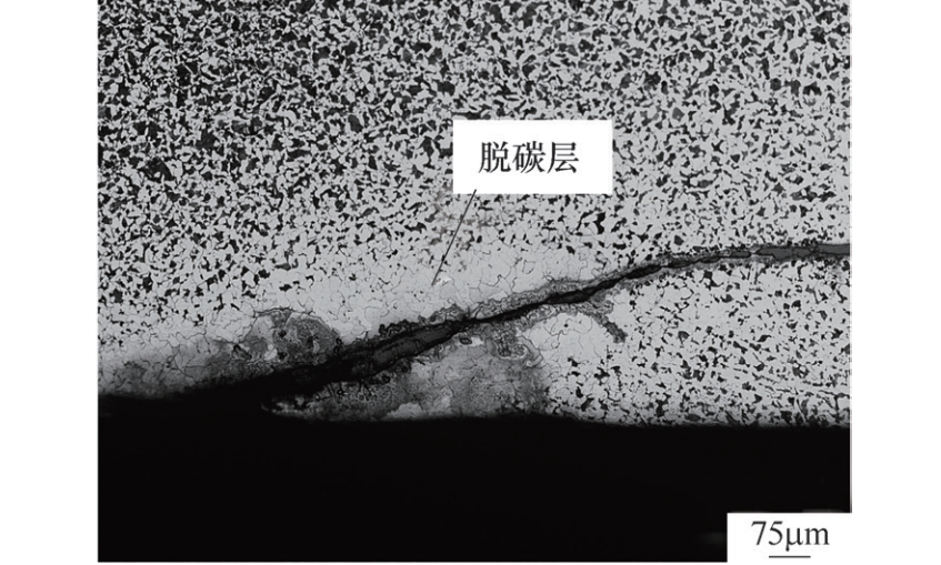 缺陷2微觀形貌如圖6所示,與缺陷1金相組織特征基本一致,缺陷以裂紋形式呈45°夾角向內部延伸,并在延伸一段后轉彎向表面擴展。裂紋起始端裂紋開口較大,兩側有大塊鐵素體,裂紋周圍有嚴重的氧化脫碳現象且尾端圓禿,與金屬流線方向一致,如圖7所示。經測量,裂紋深度在0.1~1.8mm,脫碳層深度在0.15~0.28mm。裂紋中部以縱向線性向內部延展,兩側較平滑,裂紋周圍有脫碳現象,裂紋內有非金屬夾雜物灰色物質。裂紋根部以斷續非金屬夾雜物線狀擴展,脫碳層不明顯,沒有裂紋分叉等現象。