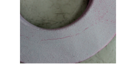 通過宏觀觀察,可以發現裂紋均位于零件背面接近中孔附近,多數裂紋長度40mm左右,形態均略呈弧形,多個廢品上裂紋缺陷的形態大體相近,個別零件上折疊痕跡明顯。裂紋位置如果對應鍛造前料段上,應為料段內部某橫截面,原料棒材整支經過超聲波檢測,幾乎可排除這個位置存在裂紋的可能性。