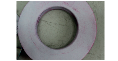 因粗車后廢品率100%,推測車光前鍛件上應存在裂紋,所以在鍛造后未進行車光零件中隨機選取2件進行了著色滲透檢驗,如圖5、圖6所示,經著色滲透后,零件背面接近內孔部位存在多處滲透劑聚集,表明粗車前鍛造后的毛坯件上即存在裂紋缺陷。