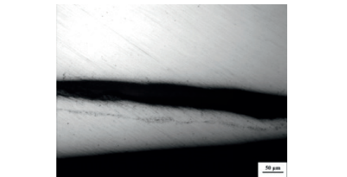 如圖3所示,在零件裂紋缺陷位置取樣,在垂直裂紋方向上進行磨拋制樣,在光學顯微鏡下由外側開始,沿裂紋延伸痕跡逐步觀察裂紋形貌。裂紋始端開口明顯,呈微小角度逐漸向內擴展,總體呈掀起狀,末端逐漸無開口,呈毛細狀延伸,放大后可見裂紋內存在明顯氧化現象,如圖7~圖12所示;腐蝕后(4%硝酸酒精溶液),組織為正常鐵素體珠光體組織,有輕微脫碳;鍛造變形產生的金屬流線痕跡清晰可見,裂紋的擴展方向整體與該流線平行。