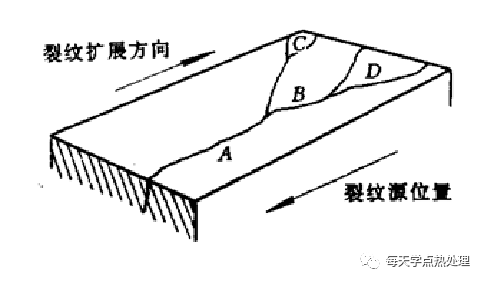 ②分叉法。多條裂紋呈分叉或分支,分叉或分支的方向即為裂紋擴展方向,匯合裂紋A為主裂紋,分叉或分支裂紋(B、C、D)為二次裂紋。