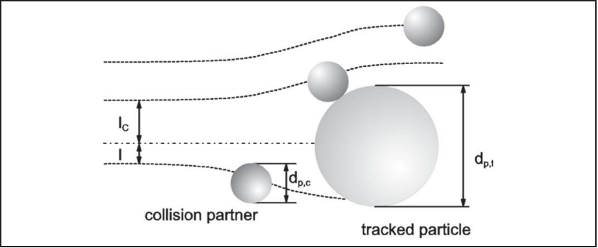 然后將確定的碰撞概率與區(qū)間[0,1]內(nèi)均勻分布的隨機(jī)數(shù)進(jìn)行比較,如果碰撞概率大于這個(gè)隨機(jī)數(shù),就發(fā)生碰撞。該凝聚模型的基本原理如圖89所示。通常情況下,較小的粒子粘附在較大的所謂收集粒子上。粒子被一層因粒子運(yùn)動(dòng)而形成的流體所包圍,這一層必須穿透。當(dāng)一個(gè)粒子在與收集粒子的距離很小范圍內(nèi)移動(dòng)時(shí),碰撞概率是相當(dāng)高的。在紊流中,由于粒子的不穩(wěn)定的運(yùn)動(dòng),即使與收集粒子的距離更大,也比層流滿足碰撞條件。當(dāng)隨機(jī)建模粒子間碰撞時(shí),必須確定碰撞位置,而不是跟蹤每個(gè)粒子,而是從控制計(jì)算的體積中粒子的平均值定義一個(gè)碰撞伙伴。因此,坐標(biāo)系統(tǒng)隨著碰撞伙伴的運(yùn)動(dòng)而調(diào)整。碰撞柱與那個(gè)坐標(biāo)系對(duì)齊,并按兩個(gè)隨機(jī)數(shù)對(duì)兩個(gè)垂直于質(zhì)點(diǎn)運(yùn)動(dòng)的角,碰撞點(diǎn)是固定的。如果粒子不團(tuán)聚,則通過(guò)根據(jù)庫(kù)侖摩擦定律求解動(dòng)量方程得到反彈后的速度分量。