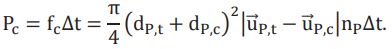 碰撞概率Pc取決于碰撞頻率fc和時(shí)間步長(zhǎng)?t。它可以用跟蹤粒子(t)和碰撞伙伴(p)的性質(zhì)來(lái)表示,這些性質(zhì)是粒子的直徑dp,t和dp,c以及速度