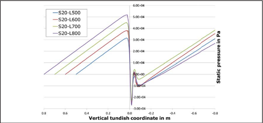 鋼水的質(zhì)量流通量基本上是由中間包中塞棒的位置控制的,數(shù)值模型的目的是盡可能好地表這種行為。因此,定義為內(nèi)部鋼水固定質(zhì)量流量或固定速度分布的邊界條件被認(rèn)為是不夠的,因?yàn)樵谶@種配置中,鋼水流量是固定的,這是一個(gè)原則問(wèn)題,它不依賴(lài)于塞棒的位置。使理想行為成為可能的邊界條件是鋼水入口和出口的壓力定義。此外,中間包內(nèi)的鋼水靜壓隨中間包液面高度加大而增加,這意味著中間包底部的鋼水靜壓力取決于中間包的鋼水液面的高度。圖90顯示了在固定的塞棒提升20 mm和不同的中間包鋼水液面高度下,中間包內(nèi)的靜壓分布,圖示表示塞桿提升(S)和中間包鋼水液面高度(L),單位為mm,中間包的底部用縱坐標(biāo)的值0表示,隨著中間包鋼水液面的增加,中間包底部和塞棒入口處的鋼水靜壓也隨之增加。因此,基于該方法,中間包鋼水液面高度對(duì)鋼水質(zhì)量通量的影響達(dá)到了預(yù)期效果。