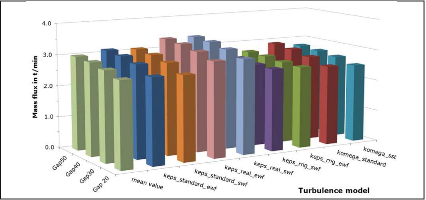 圖92顯示了研究的湍流模型的鋼水流通量,包括所有選擇模型的平均值。除湍流模型外,塞棒的抬升高度也不同,即塞棒與水口之間的間隙大小不同。必須注意的是,墻體處理對(duì)結(jié)果的影響不大。此外,所有類(lèi)型的湍流模型在鋼水流通量方面都顯示出相似的結(jié)果。基于這些結(jié)果選擇合適的湍流模型是困難的,甚至無(wú)法消除單一的湍流模型。為此,我們進(jìn)行了文獻(xiàn)調(diào)查。總結(jié)了中間包宏觀數(shù)值模擬中不同湍流模型的主要特點(diǎn)和優(yōu)缺點(diǎn): [18]