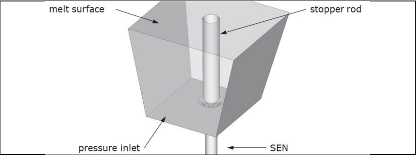 為了在宏觀尺度上調(diào)整/發(fā)展數(shù)值模型,即選擇合適的湍流模型和實(shí)施塞棒吹氬,采用中間包的簡(jiǎn)化表示,這個(gè)數(shù)字化的3D視圖如圖91所示。