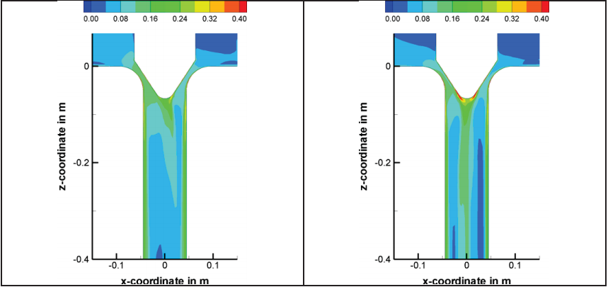 圖119顯示了中間包鋼水液面高度和塞棒提升高度最大值時(shí)塞棒調(diào)整的速度,塞棒頭部的平面修改和橢圓修改顯示了預(yù)期的速度場(chǎng),鋼水沿垂直方向的延伸速度的最大值沿水口內(nèi)壁方向流動(dòng)。此外,塞棒下方的回流區(qū)域是可見(jiàn)的,對(duì)于塞棒頭部的平面設(shè)計(jì),回流區(qū)域較大;而對(duì)于塞棒頭部橢圓形設(shè)計(jì),回流區(qū)域較小。然而,橢圓的結(jié)構(gòu)顯示了水口內(nèi)不對(duì)稱(chēng)流場(chǎng)的趨勢(shì),一個(gè)可能的解釋從中間包流入的鋼水是不均勻的。中間包的入口在圖的左邊,中間包鋼水液面高度和塞棒提升高度的影響基本上與附錄C.3中報(bào)道的原始塞棒相當(dāng)。