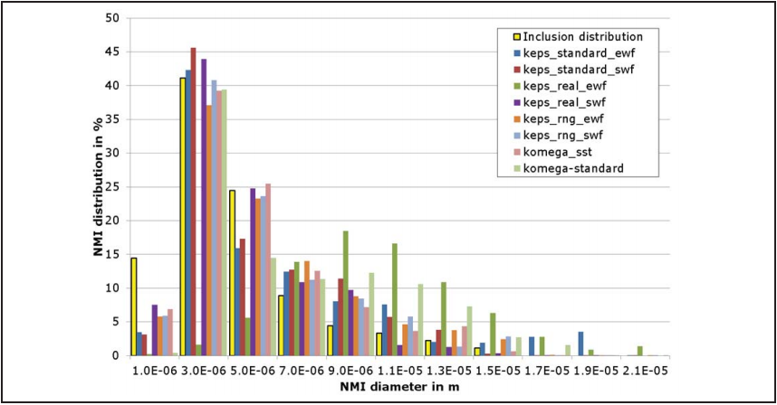 圖96顯示了不同湍流模型的夾雜物NMI分布。很明顯,特別是k-H可實(shí)現(xiàn)湍流模型與增強(qiáng)水口型壁處理顯示出強(qiáng)烈的差異,特別是在大直徑的夾雜物出現(xiàn)的結(jié)果。在k-Ω標(biāo)準(zhǔn)模型中可以檢測(cè)到類(lèi)似但較弱的趨勢(shì),可以說(shuō)明,對(duì)同一湍流模型實(shí)施不同的型壁處理會(huì)導(dǎo)致夾雜物NMI團(tuán)聚方面的差異消失。標(biāo)準(zhǔn)型k-H湍流模型和RNG湍流模型的結(jié)果具有可比性。