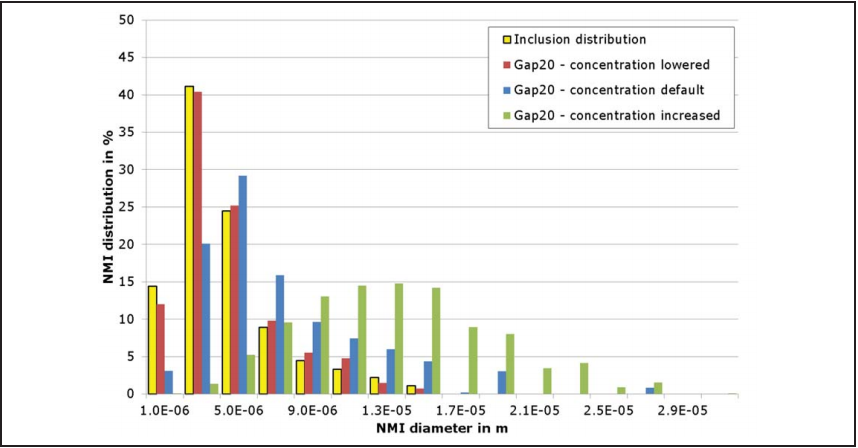 圖95顯示了非金屬夾雜物NMI濃度對(duì)粒子團(tuán)聚的影響,最初的直徑分布是黃色的,有一個(gè)細(xì)的黑色框架包圍。低的非金屬夾雜物NMI濃度也降低了夾雜物粒子碰撞的概率,即對(duì)直徑分布的影響很小。圖95中的紅色條形圖表示夾雜物濃度降低,實(shí)際上與初始直徑分布只有輕微的差別。綠條表示的濃度增加導(dǎo)致了直徑分布的顯著差異——正如預(yù)期的那樣,這是由于NMI碰撞的概率大大增加所致。直徑為1μm的夾雜物完全消失,其平均值由3 μm轉(zhuǎn)變?yōu)?/span>13 μm。這與工業(yè)生產(chǎn)上得到的試樣檢驗(yàn)不一致,但表明夾雜物團(tuán)聚模型是基本正確的。預(yù)設(shè)夾雜物NMI直徑分布結(jié)果表明,1 μm的小直徑的夾雜物仍然存在,但是明顯減小,平均直徑現(xiàn)在移到了5 μm。這是一個(gè)額外的指標(biāo),表明團(tuán)聚可能的結(jié)果取決于初始夾雜物NMI的濃度。