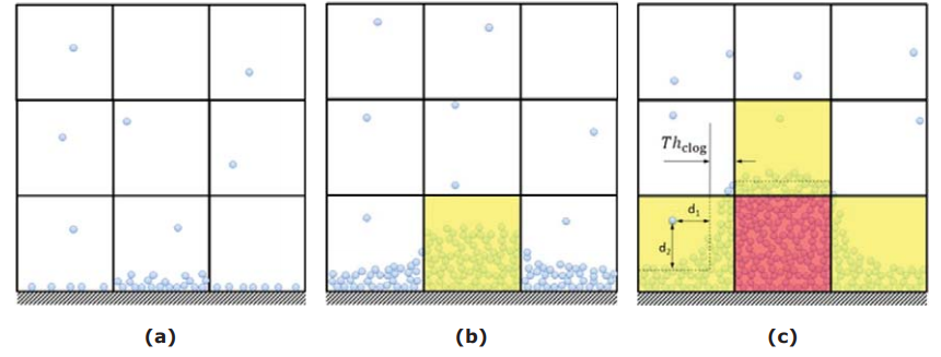 (c)當(dāng)fclog達(dá)到1.0時(shí),細(xì)胞標(biāo)記變?yōu)椤凹t色”,如圖99 (c)所示,面結(jié)合的鄰近單元標(biāo)記為“黃色”,阻塞物繼續(xù)在黃色細(xì)胞中生長(zhǎng)。
