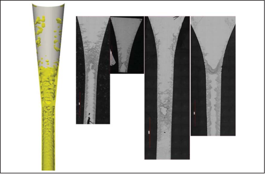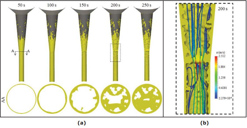 進(jìn)行了全三維計(jì)算,但這里只顯示了一半?yún)^(qū)域內(nèi)的流場(chǎng)圖形,圖101顯示了堵塞的演變。堵塞前沿的快照和橫截面圖說(shuō)明了圖101 (a)中堵塞沉積的增長(zhǎng)情況。50秒后,水口最窄部分和中部部分被夾雜物沉積顆粒覆蓋了型壁,然后,在100秒和150秒后,粗糙型壁在隨機(jī)位置形成。在200秒和250秒時(shí)的快照顯示,有些凸起增長(zhǎng)得更快,特別是在最窄部分的頂部。最后,堵塞沉積物不斷增長(zhǎng),直到水口的橫截面完全被堵塞。圖101 (b)顯示了非金屬夾雜物NMI粒子注入后的200秒的流線阻塞的放大圖,在阻塞形成后,不穩(wěn)定的流動(dòng)模式導(dǎo)致不規(guī)則的阻塞增長(zhǎng)。
