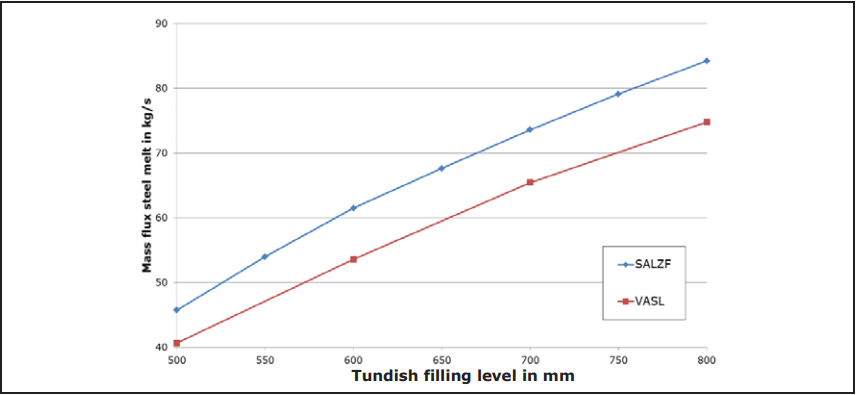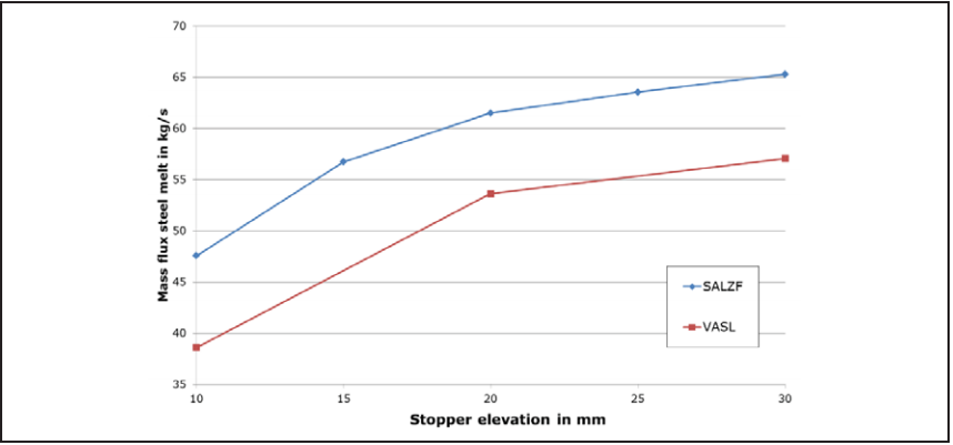 SALZF鋼廠和VASL鋼廠的連鑄機(jī)配有不同內(nèi)徑的浸入式水口, SALZF鋼廠為φ80 mm, VASL鋼廠為φ75 mm。圖105顯示了在中間包鋼水液面高度決定塞棒升高量,從而保持鋼水流通量。塞棒升高量在10mm到30mm之間,鋼水流通量的的上升是一個(gè)漸近的過(guò)程,即對(duì)于塞棒上升到一定情況,鋼水流通量似乎接近一個(gè)恒定值。顯然,小間隙的流體機(jī)械阻力與所產(chǎn)生的鋼水流通量之間是不成比例的關(guān)系。