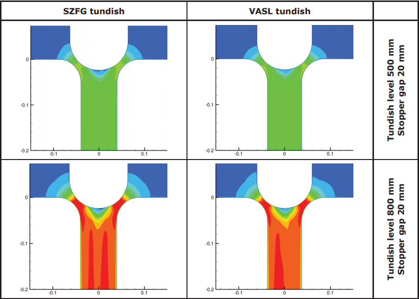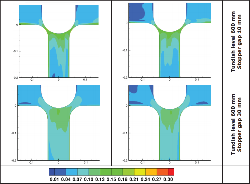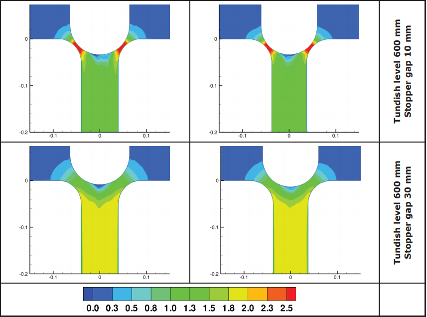 預(yù)計(jì)猜想夾雜物的團(tuán)聚行為主要受鋼的速度和湍流波動(dòng)的影響,圖107顯示了兩個(gè)鋼廠連鑄機(jī)中間包鋼水液面高度和塞棒升高的極值時(shí)鋼液的速度大小。典型的所有速度結(jié)果是在塞棒和水口間隙的最大速度和在塞棒尖端以下的一個(gè)非常低的速度區(qū)域,SALZF鋼廠與VASL鋼廠的連鑄機(jī)的流通量雖然差異達(dá)16%,但是其偏差值很小。一個(gè)有趣的觀察是,一個(gè)10mm小的塞棒升高,導(dǎo)致一個(gè)明顯效果,塞棒間隙流速達(dá)到最大值,即最大的速度出現(xiàn)在最小的間隙情況下。當(dāng)塞棒升高為30 mm時(shí),速度最大值一定出現(xiàn)在更大的區(qū)域,即最大的速度出現(xiàn)在間隙中以及塞棒尖端以下。
