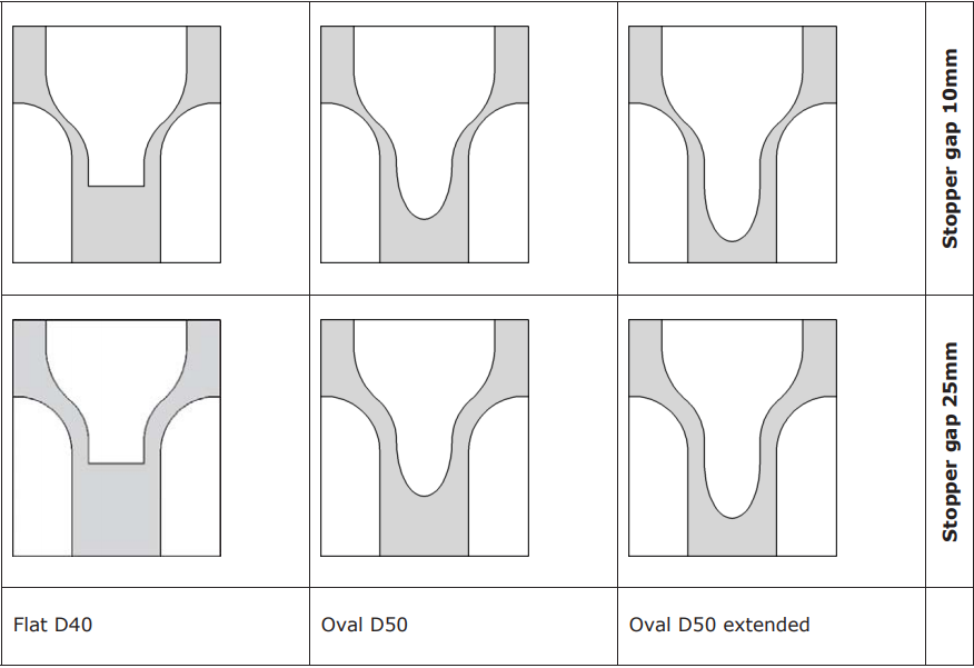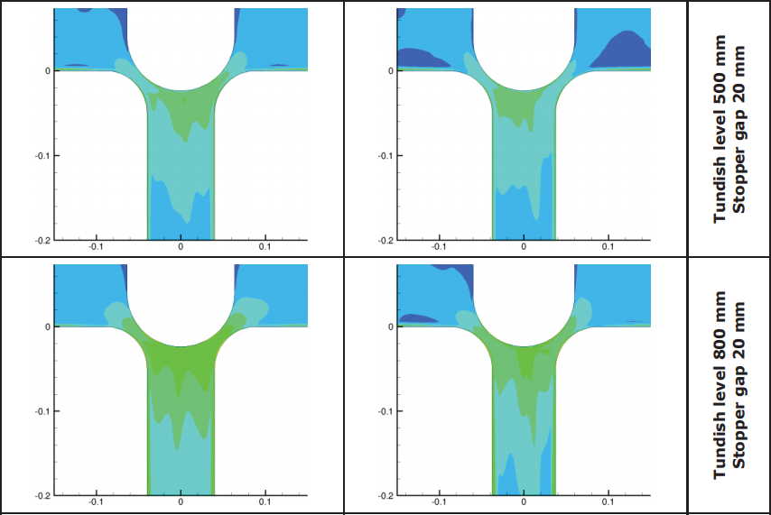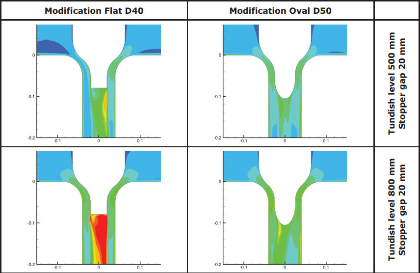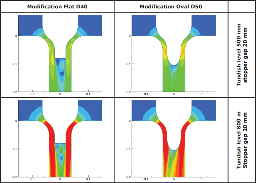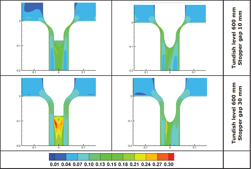 在以前的RFCS研究項(xiàng)目中,推導(dǎo)出了一種新的塞棒幾何形狀[5],該設(shè)計(jì)的目的是修改鋼水流動(dòng)條件,導(dǎo)致流向平行于水口內(nèi)壁墻。其基本思想是避免流動(dòng)再循環(huán),加速鋼水靠近水口,以防止堵塞沉積。考慮的結(jié)果是設(shè)計(jì)一個(gè)漏斗形的水口,應(yīng)使鋼水流方向向下,平行于水口內(nèi)壁,避免在水口內(nèi)壁墻處形成回流區(qū)。然而,這種設(shè)計(jì)的應(yīng)用將在塞棒下方形成另一個(gè)回流區(qū),假定在這個(gè)位置,回流區(qū)不會(huì)引起堵塞問(wèn)題。此外,惰性氣體通過(guò)塞棒頭部噴射也會(huì)對(duì)其產(chǎn)生影響。漏斗形塞棒設(shè)計(jì)進(jìn)行了三種修改:一種是和原來(lái)相近的平頭,兩種是橢圓頭,目的是避免塞桿下方的回流區(qū),不同的橢圓形修改是一個(gè)20毫米的擴(kuò)展。這些修改如圖117所示,其中塞棒為白色,鋼水為灰色。考慮了兩個(gè)塞棒升高(10mm和25mm)的參數(shù),以及兩個(gè)中間包鋼水液面高度(500mm和800mm)。這些方法在SALZF鋼廠連鑄機(jī)中進(jìn)行了數(shù)值試驗(yàn)。